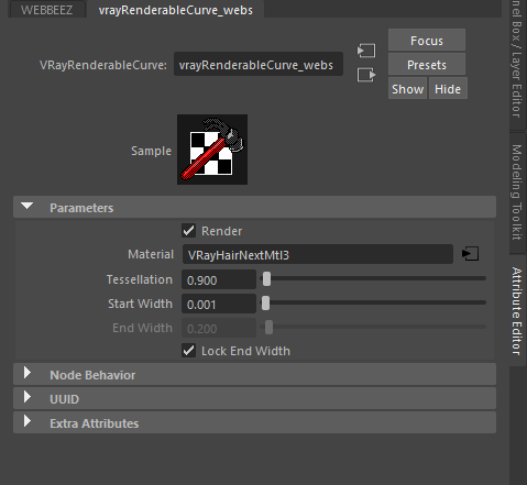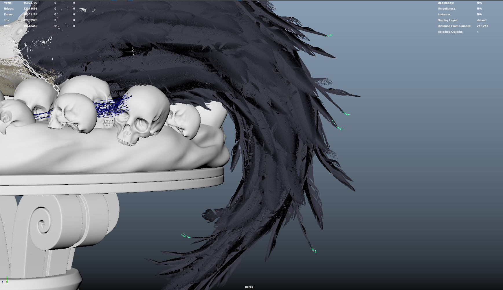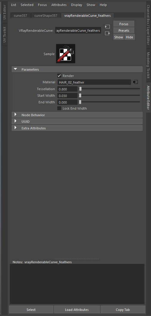 Yeti has an incredible feather feature built in, however, I wasn’t getting the tapered look I hoped for in the final render. So, I resorted to hand-placing a few curves and rendering them via VRay renderable curves. I used the same material as I did for the feathers here so that the iridescence would be consistent. I also tapered the width to further thin the feather ends.