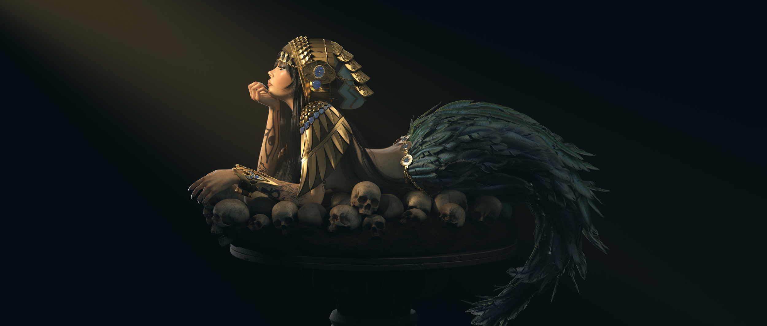 Modeled in Maya, sculpted in ZBrush, skin textured in Mari, hard-surface textured in Substance Painter, groomed in Yeti and rendered in VRay.