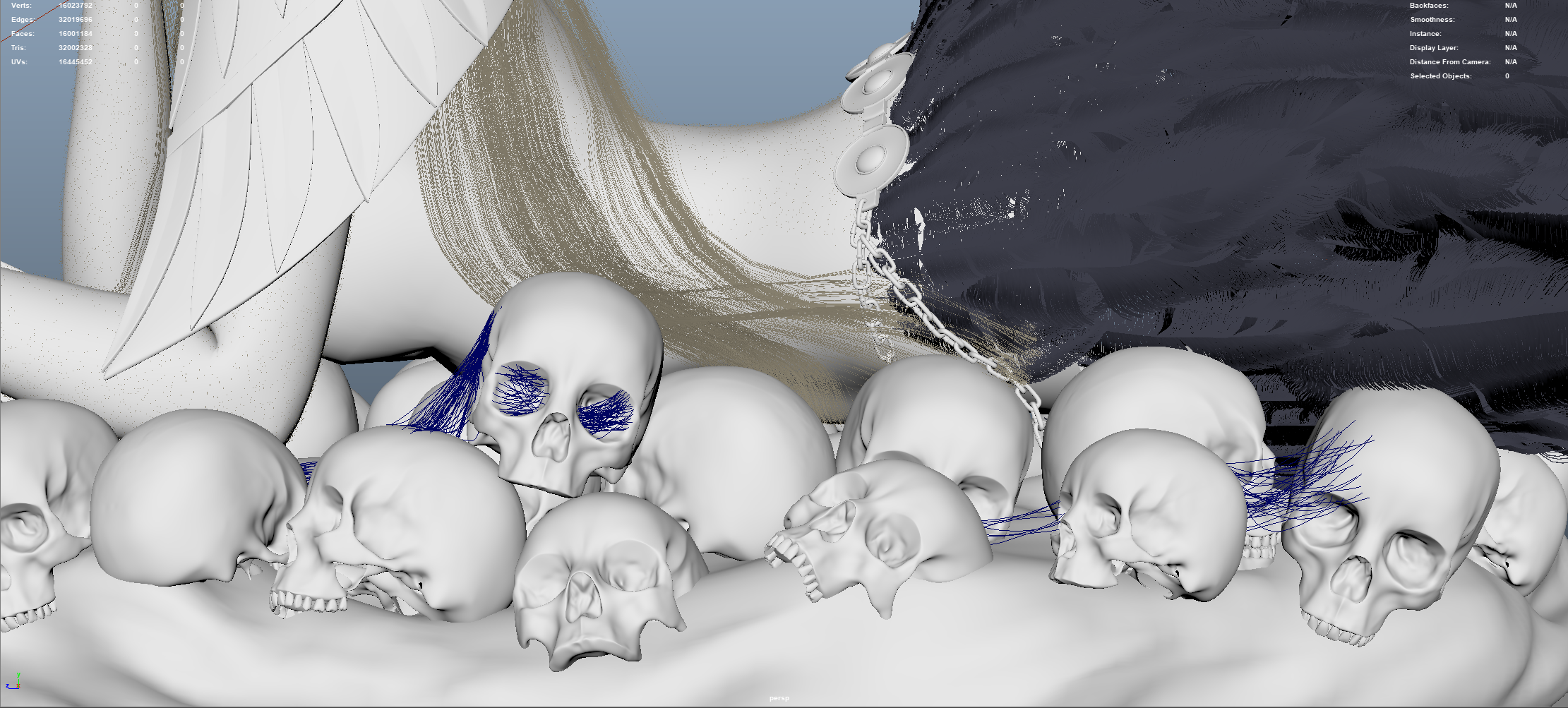 I split the grooms into three categories: facial hair, scalp hair & feathers. For facial hair, I created eyebrows, eyelashes and peach fuzz. Her scalp hair is made up of 5 different grooms and the feathers (not pictured in the outliner) are created also using 5 different grooms.